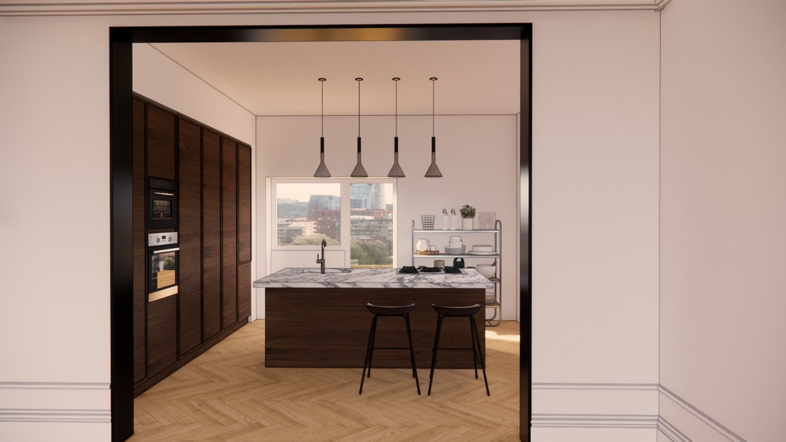 La sua superficie di c.ca 180 mq si compone di ampio ingresso , salone doppio con terrazza, cucina abitabile con balconcino di servizio, due camere da letto, uno studio, due bagni e piccola zona di servizio con guardaroba.